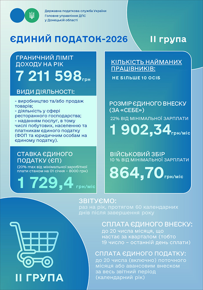 У 2026 році, як й у 2025 році, ВЗ для ФОПів І, ІІ й ІV груп встановлено у розмірі 10% від 1 розміру МЗП на 1 січня звітного року (тож у 2026 році це буде 864,7 грн), а для ФОПів та юросіб ІІІ групи ЄП – у розмірі 1% від доходу.