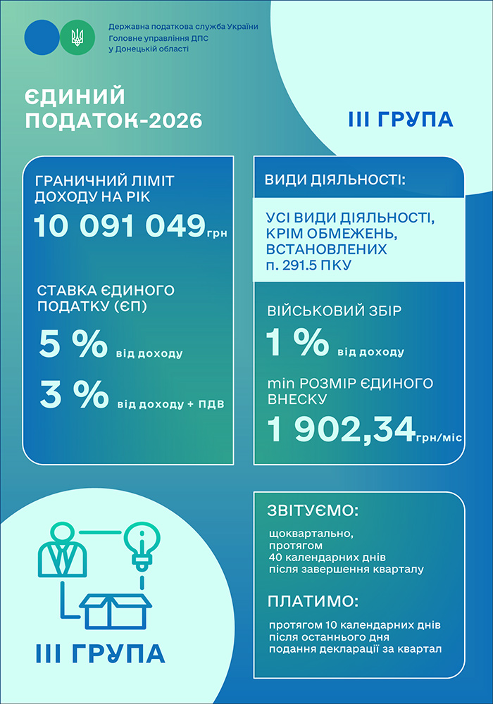 А зараз зʼявилася інфографіка від територіальних податківців щодо ставок ЄП та розмірів граничних доходів для «єдинників» І-ІІІ груп на 2026 рік.