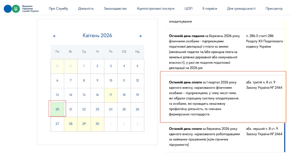 Доволі часто територіальні податківці розуміють цю норму буквально і вважають, що 20-го числа платити вже пізно, останній день «до» – це 19 число. Але за календарем ДПСУ останнім днем сплати ЄСВ ФОПами за І квартал є саме 20 квітня 2026 року, оскільки 19 число припадатиме на неділю.
