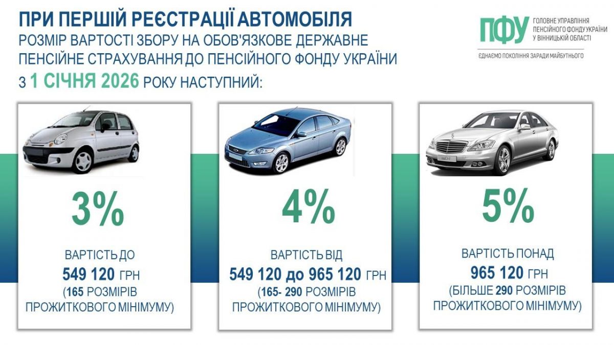 Головне управління Пенсійного фонду України у Вінницькій області повідомляє, що з 1 січня 2026 року змінився розмір суми збору на обов’язкове державне пенсійне страхування при першій державній реєстрації легкового автомобіля в Україні. Прожитковий мінімум для працездатних осіб становить 3328 грн. Об’єктом оподаткування є вартість автомобіля без ПДВ, визначена відповідно до договору купівлі-продажу або інших підтверджуючих документів. Залежно від вартості, встановлено диференційовані ставки збору: