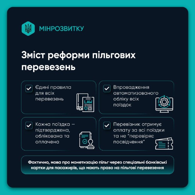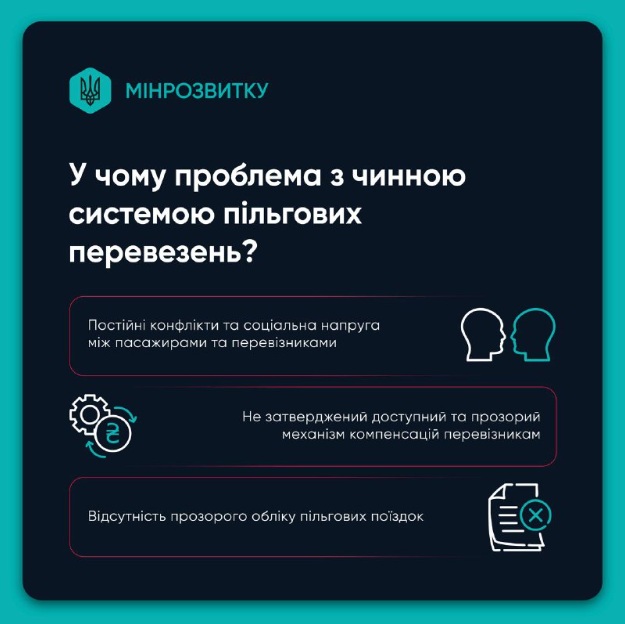 Міністерство розвитку громад та територій зазначає, що система пільгового проїзду десятиліттями існує у форматі, який створює конфлікти замість підтримки: люди з пільгами змушені доводити своє право на проїзд, перевізники – перевозити без гарантій компенсації, громади – шукати кошти в обмежених бюджетах.