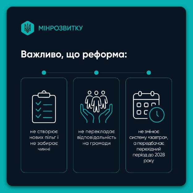Важливо: реформа не скасовує чинні пільги, не перекладає відповідальність на громади і передбачає перехідний період до 1 липня 2028 року – для спокійної адаптації системи та людей.