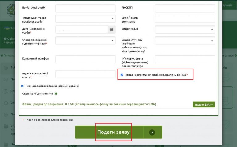 надайте згоду на отримання e-mail-повідомлень від органів Пенсійного фонду України та натисніть “Подати заяву“.