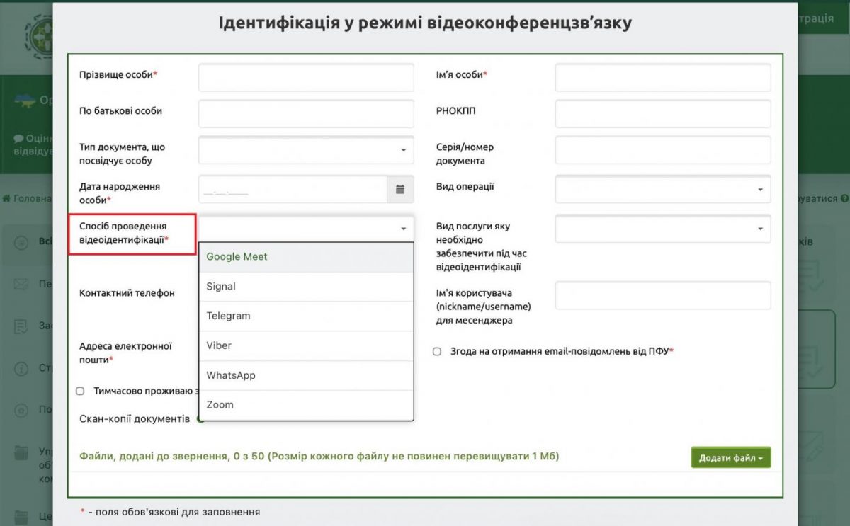заповніть особисті дані; дані документа, що посвідчує особу; вкажіть адресу електронної пошти та номер телефону (для отримання зворотного контакту від фахівців Пенсійного фонду України); з випадаючого списку оберіть спосіб проведення відеоідентифікації через один із запропонованих додатків: Google Meet, Signal, Telegram, Viber, WhatsApp, Zoom;