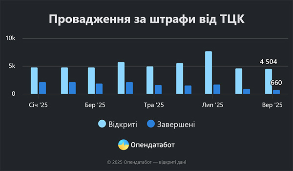 Опендатабот розповідає, що понад 47 тисяч проваджень за порушення правил військового обліку було відкрито від початку 2025 року. Третина з них наразі вже завершена. Близько 4,5 тисячі проваджень на місяць відкривають ТЦК цьогоріч. З них 98 штрафів отримали жінки. Рекордні 9 проваджень на одну людину було відкрито проти двох чоловіків на Сумщині.