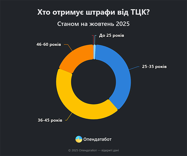 Переважна більшість оштрафованих – чоловіки віком від 25 до 45 років (80% випадків), тоді як на жінок припадає 98 випадків – це лише 0,2% від загальної кількості. Варто зазначити, що з 31 липня 2025 року діє новий механізм постановки на військовий облік жінок з медичною чи фармацевтичною освітою – з цього часу було відкрито 26 проваджень проти жінок за новими правилами.