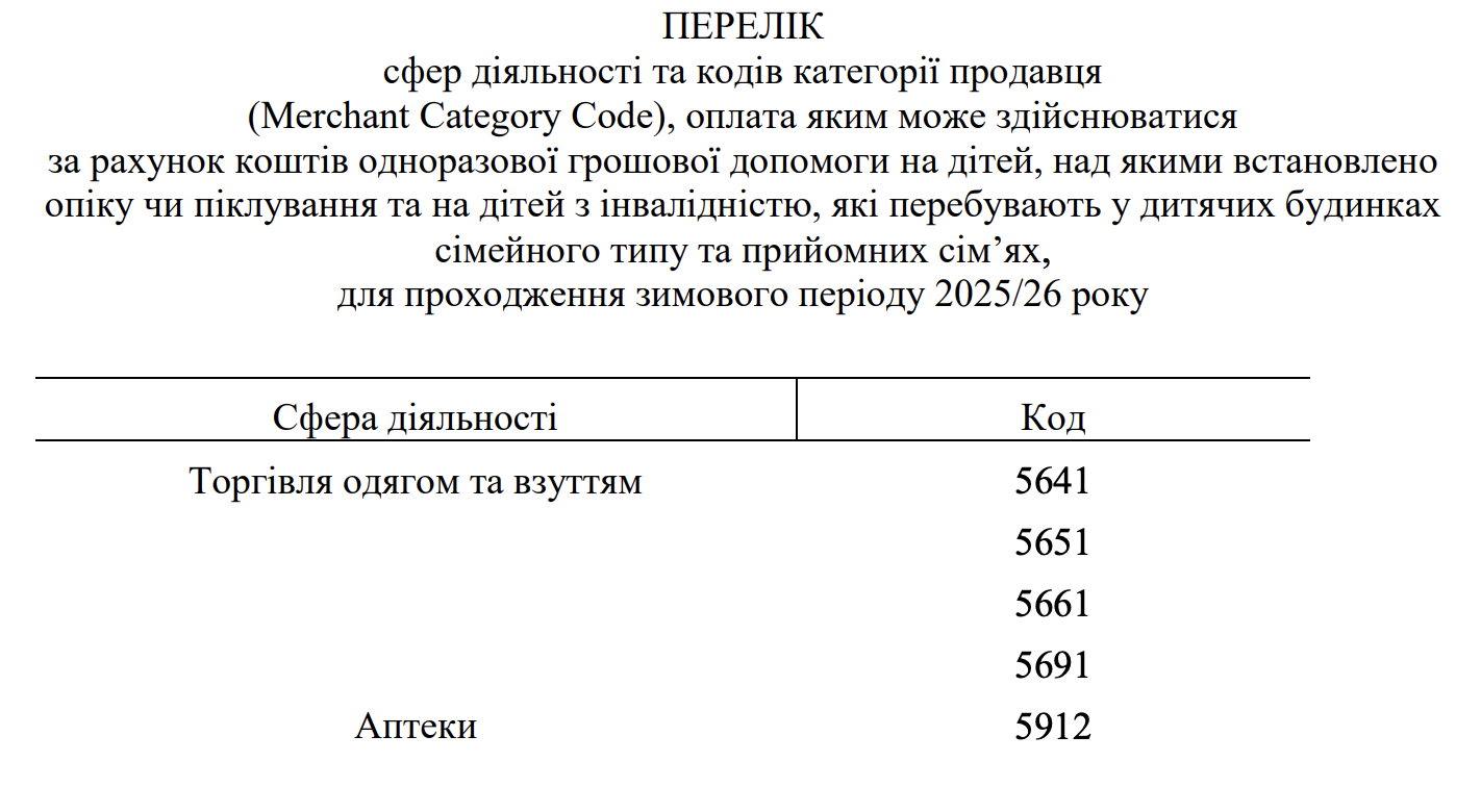 - інших закладах торгівлі, які провадять свою господарську діяльність на території України та з 1 січня 2026 р. внесені до переліку закладів торгівлі, які долучилися до продажу одягу, взуття (далі – заклад торгівлі)за рахунок коштів одноразової грошової допомоги.