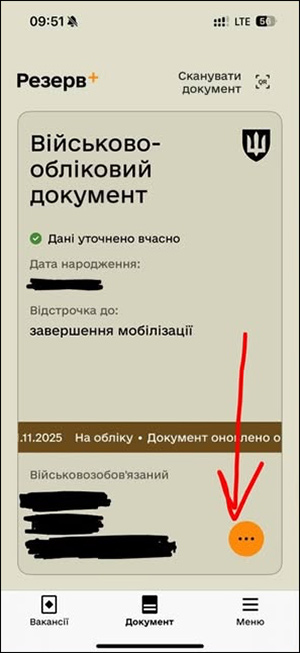 1. Зайти у Резерв+ і натиснути помаранчеву кнопку з трьома крапками на екрані військово-облікового документа.