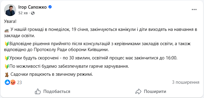 Очільник міста Бровари (у Київській області) Ігор Сапожко повідомив, що зимові канікули у громаді закінчуються у понеділок, 19 січня.