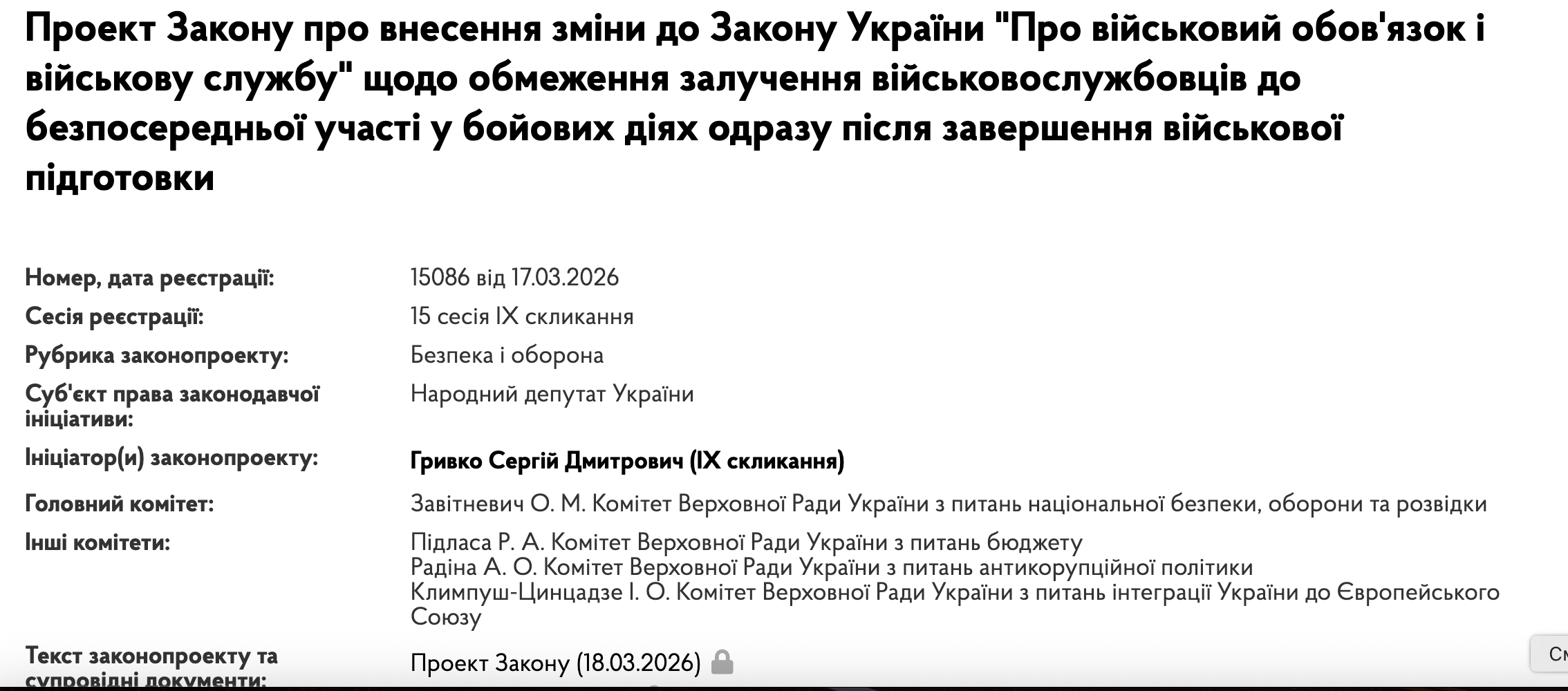 17 березня 2026 року у ВРУ зареєстровано проєкт Закону №15086 "Про внесення зміни до Закону України "Про військовий обов'язок і військову службу" щодо обмеження залучення військовослужбовців до безпосередньої участі у бойових діях одразу після завершення військової підготовки". Його автором є С. Гривко.