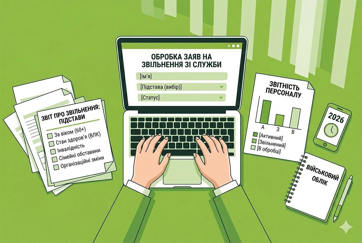 - Звітність з військового обліку для подання у ТЦК та СП (прийняття на роботу військовозобов’язаного працівника і його звільнення, повідомлення щодо зміни облікових даних, звіряння Списків персонального військового обліку)