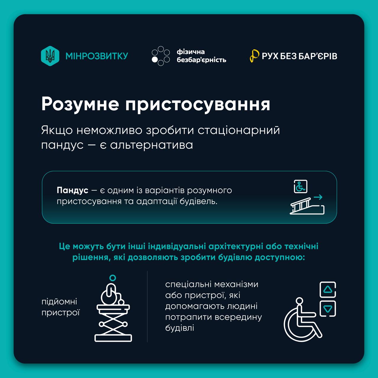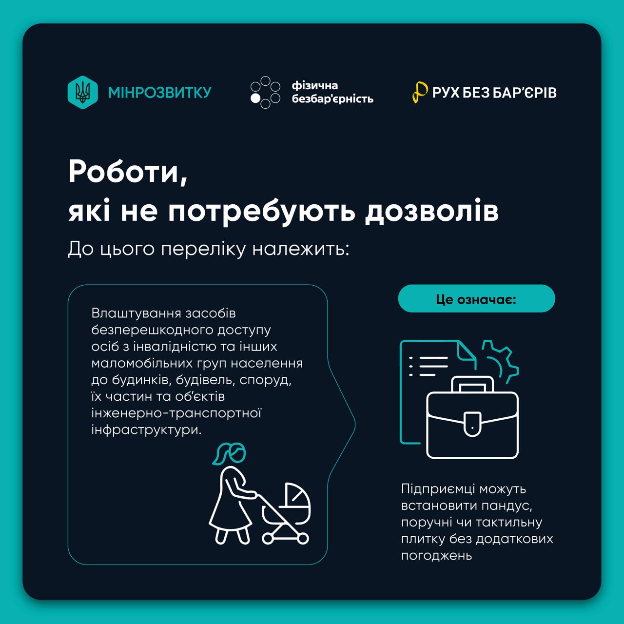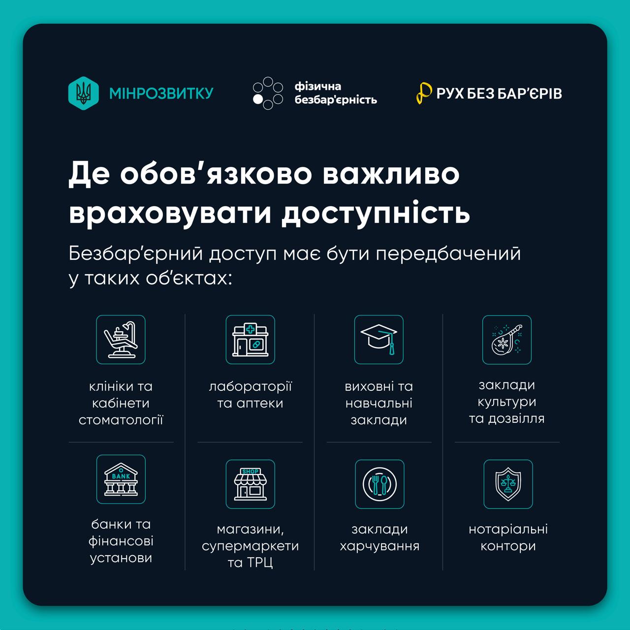 Міністерство розвитку громад та територій України зазначає, що в Україні діють державні будівельні норми «Інклюзивність будівель і споруд», які встановлюють обов’язкові вимоги до створення безперешкодного доступу для всіх маломобільних груп населення.