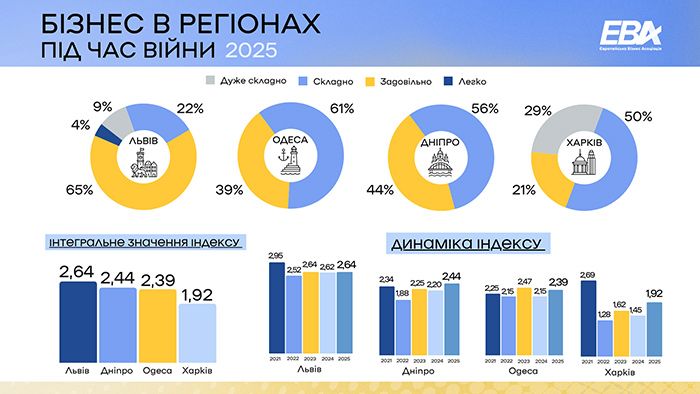 У порівнянні з минулим роком оцінки ситуації у всіх регіонах дещо покращились. Інтегральна оцінка індексу склала у Львові – 2,64 бала (2,62 у 2024 році), у Дніпрі – 2,44 бала (2,20), в Одесі – 2,39 бала (2,15) та у Харкові – 1,92 бала (1,45). Умови ведення бізнесу компанії переважно оцінюють як складні і тільки на заході більшість компаній вважають їх задовільними.