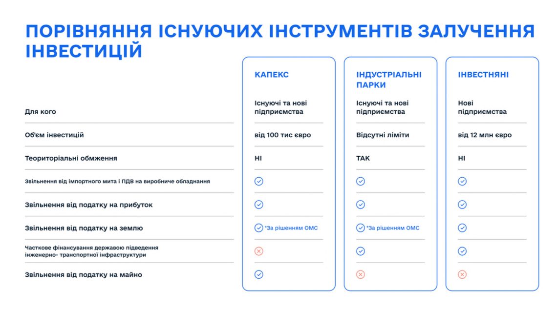 «Головна відмінність в тому, що компенсацію інвестицій через податки зможуть отримати не тільки нові підприємства (як в індустріальних парках), а й діючі за свої інвестиції в модернізацію чи відбудову. Натомість перевагою індустріальних парків є підтримка з боку держави розбудови їхньої інфраструктури», – пояснив парламентар.