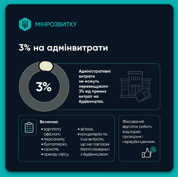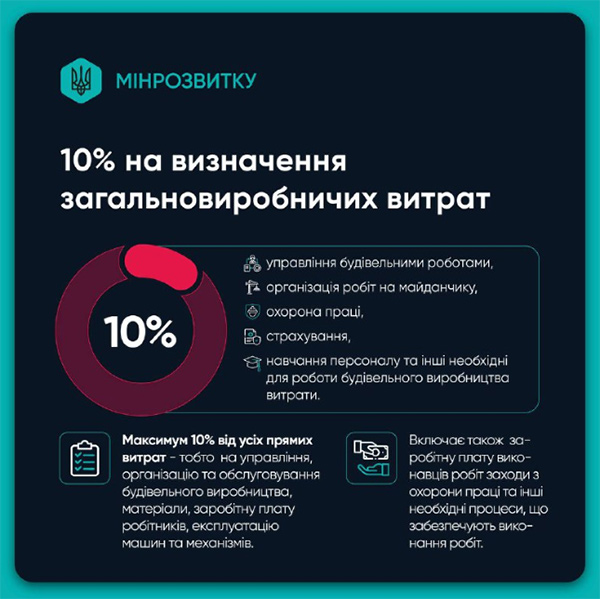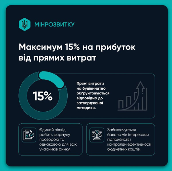 Йдеться про те, що держава встановлює фіксовані ліміти на основні витрати і прибуток: 10% на визначення загальновиробничих витрат, 3% на визначення адміністративних витрат та 15% на прибуток від прямих витрат. Ці фіксовані відсоткові орієнтири гарантують, що розрахунок вартості будівництва стає зрозумілим, об'єктивним і прозорим для кожного учасника ринку.