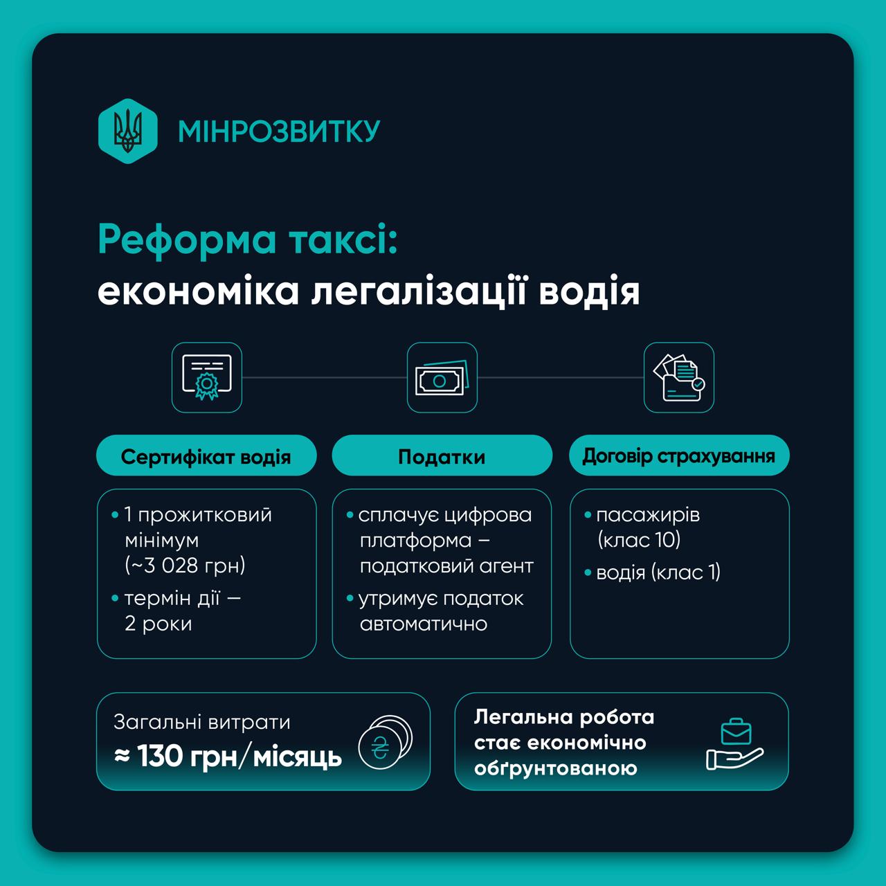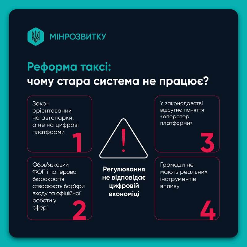 «Сьогодні ми маємо парадоксальну ситуацію: офіційно в Україні близько 9,5 тисяч ліцензованих таксі, тоді як фактично на ринку працює понад 200 тисяч водіїв. Тобто близько 90% ринку перебуває в тіні. Це означає втрати для бюджету, відсутність соціальних гарантій для водіїв і мінімальні інструменти безпеки для пасажира. Наша задача – створити просту, цифрову і економічно вигідну модель легалізації, де водію дешевше працювати офіційно, ніж залишатися в тіні», – зазначив віцепрем'єр-міністр з відновлення України – Міністр розвитку громад та територій Олексій Кулеба.