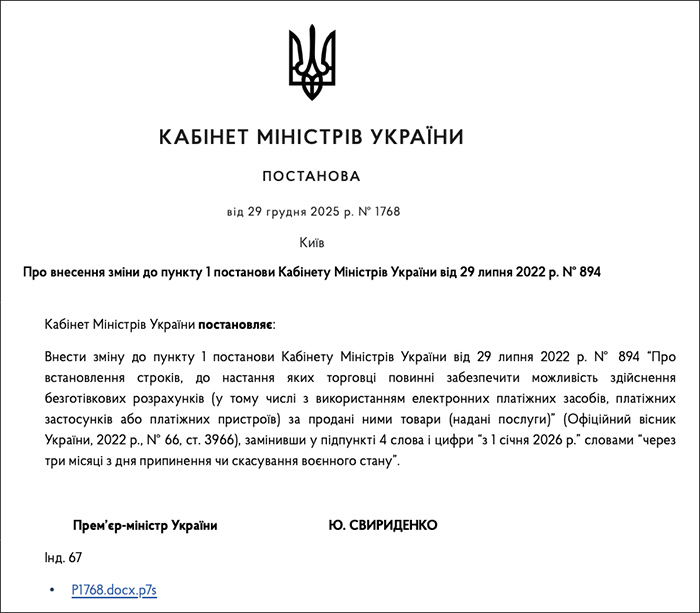 На сайті КМУ вже зʼявився текст затвердженої постанови від 29.12.2025 №1768. З нею можна ознайомитися за посиланням. Її поки не опубліковано в «Урядовому курʼєрі».