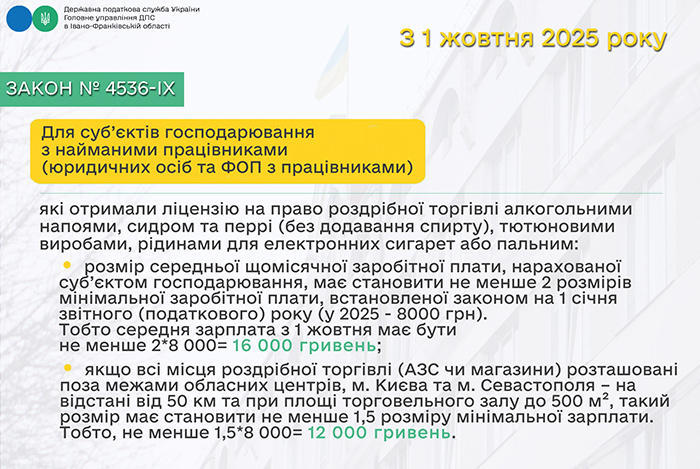 Зокрема, для всіх роботодавців, що отримали ліцензію на право роздрібної торгівлі алкоголем, сидром та перрі (без додавання спирту), тютюном, рідинами для е-сигарет або пальним розмір середньої щомісячної зарплати має становити не менше 2 МЗП