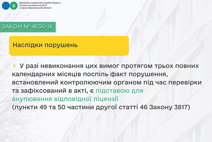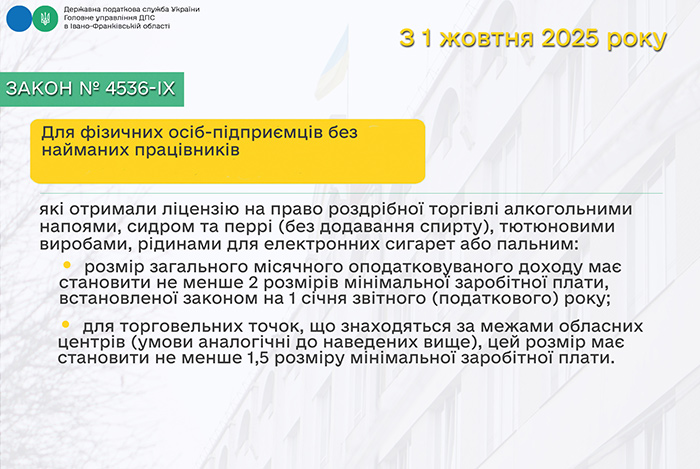 ДПС в Івано-Франківській області розповідає, що Законом України від 16.07.2025 №4536-IX «Про внесення змін до Податкового кодексу України та інших законодавчих актів України у зв’язку з прийняттям Закону України «Про інтегроване запобігання та контроль промислового забруднення» та за метою удосконалення окремих положень податкового законодавства» (далі – Закон №4536) з 1 жовтня визначені вимоги до ліцензіатів алкогольного, тютюнового та паливного ринку.