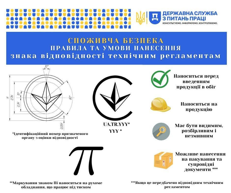 Перед наданням на ринку України розповсюджувачі перевіряють наявність на виробі знака відповідності, необхідних документів, інструкцій, декларацій та інформації, визначеної Технічним регламентом, що складені державною мовою, а в разі їх складення іншою мовою – перекладу державною мовою. Знак відповідності Технічному регламенту безпеки машин та ЗІЗ є видимим, розбірливим і незмивним.