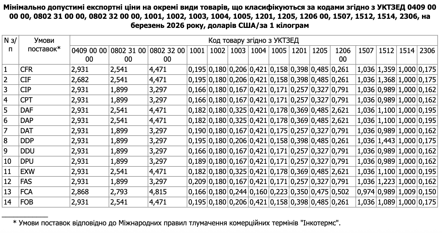 Мінекономіки наказом від 10.03.2026 №3853 затвердило на березень 2026 року мінімально допустимі експортні ціни на окремі види товарів, що класифікуються за кодами згідно з УКТЗЕД: