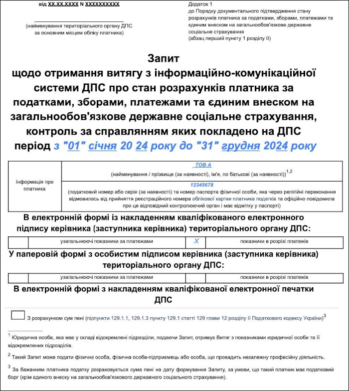 Важливо! Якщо платником у запиті не обрано додаткові реквізити, то платник отримає Витяг в електронній формі з показниками в розрізі платежів, які обліковуються в ІКС ДПС за основним / неосновним місцем обліку такого платника в територіальних органах ДПС, з накладенням кваліфікованої електронної печатки ДПС та без розрахунку сум пені за формою згідно з додатком 4 до цього Порядку.