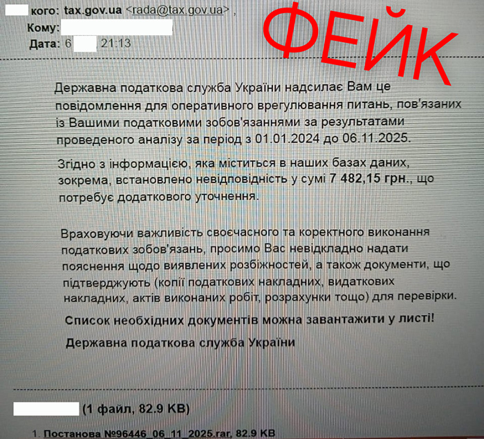 ДПС в Одеській області звертає увагу щодо розсилки фейкових електронних листів нібито «від імені Державної податкової служби України про оперативне врегулювання питань пов’язаних з податковими зобов’язаннями» з вкладенням у вигляді RAR-файлу, який містить «Постанова_№_96446_06_11_2025.rar», 82.9 КВ.