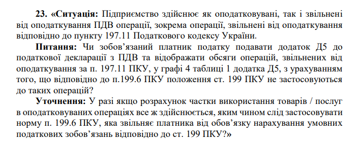 Про те, що податківці вимагають включати звільнені за п. 197.11 ПКУ операції до розрахунку частки неоподаткованих операцій у додатку Д5, ми дізналися з листа ДПСУ від 24.02.2026 №197/2/99-00-21-01-01-02, який є, по суті, збірником відповідей центрального податкового органу на актуальні запитання від платників податків.