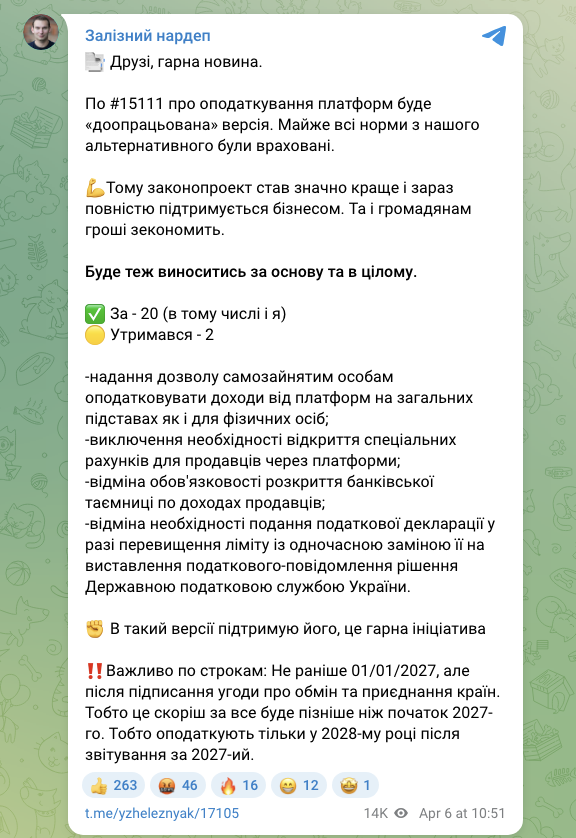 Нова версія дозволяє самозайнятим оподатковувати доходи на загальних підставах, скасовує обов’язкове відкриття спеціальних рахунків та подання декларацій у разі перевищення ліміту.