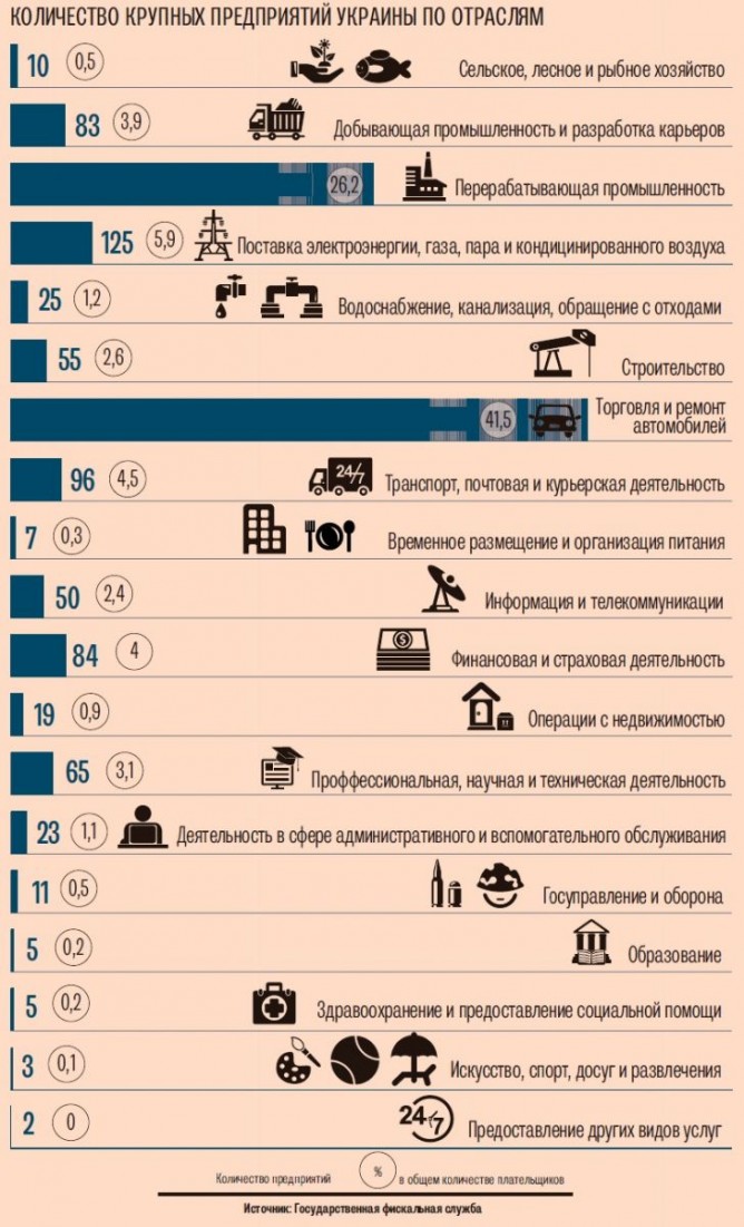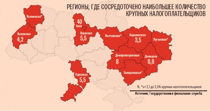 Согласно статистике ГФС, восток Украины — не самый популярный регион среди крупных налогоплательщиков. Львиная доля таких предприятий находится в Киеве и Киевской области. Донецкий и днепропетровский регионы — на втором и третьем местах. Наибольшее их количество сосредоточено в сферах оптовой торговли и перерабатывающей промышленности. На вопрос о перечне предприятий, которые перечислили в госбюджет наибольшие суммы налогов, в ГФС не ответили, сославшись на то, что Налоговый кодекс оставляет за налогоплательщиком «право на неразглашение контролирующим органом сведений о таком плательщике без его письменного согласия». В прошлом году, согласно отчетности ГФС, основными бюджетообразующими предприятиями были государственные структуры — НАК «Нафтогаз України», ОАО «Укрнафта», ГК «Укргаздобыча», ЗАО «УкрГаз-Энерго», ГП НАЭК «Энергоатом», ГП «Энергорынок».