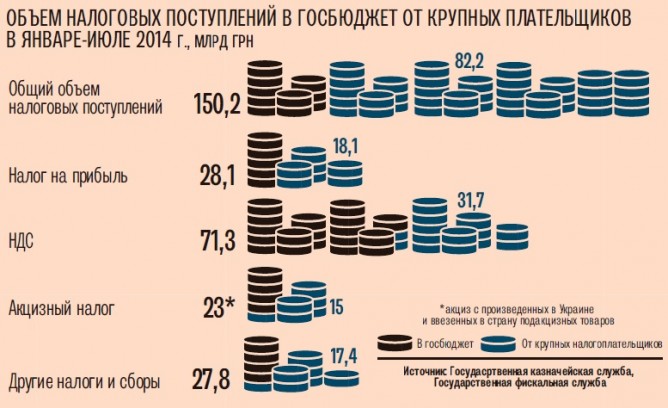 Как сообщили в пресс-службе Государственной фискальной службы (ГФС), в январе-июле 2014 г. крупные налогоплательщики обеспечили в казну 82,2 млрд грн поступлений, что на 5,2 млрд грн, или на 6 , меньше, чем за аналогичный период прошлого года. Удельный вес крупного бизнеса в общей сумме сбора налоговых платежей в госбюджет составляет 71 . Всего в стране зарегистрирован 2121 крупный плательщик. К ним, согласно действующему законодательству, относятся компании с годовым доходом более 500 млн грн или же суммой уплаченных за год налогов свыше 12 млн грн.