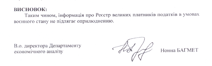 Це не дивно: адже відповідно до інформаційної довідки ДПС «інформація про Реєстр великих платників податків в умовах воєнного стану не підлягає оприлюдненню».