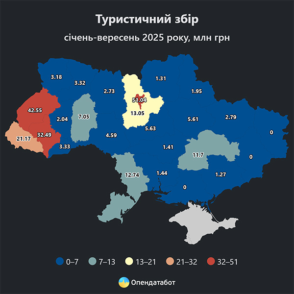 Опендатабот розповідає, що 91,7 млн грн туристичного збору надійшло у місцеві бюджети з липня по вересень 2025 року за даними Державної податкової служби. Загалом 234,4 млн грн туристичного збору сплатили бізнеси за 9 місяців 2025 року. Це у 1,5 раза більше, ніж за аналогічний період до початку повномасштабної. Найбільшими «годувальниками» місцевих бюджетів залишаються Київ, Львівщина та Франківщина.
