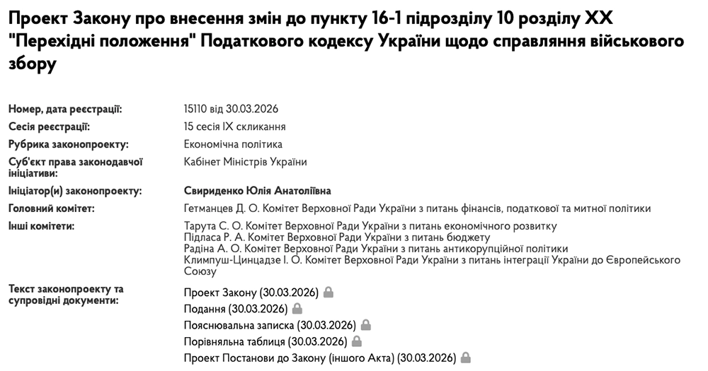 Наразі ми зупинимося на законопроєкті №15110 про внесення змін до п. 16-1 підрозділу 10 розділу XX «Перехідні положення» ПКУ щодо справляння військового збору.