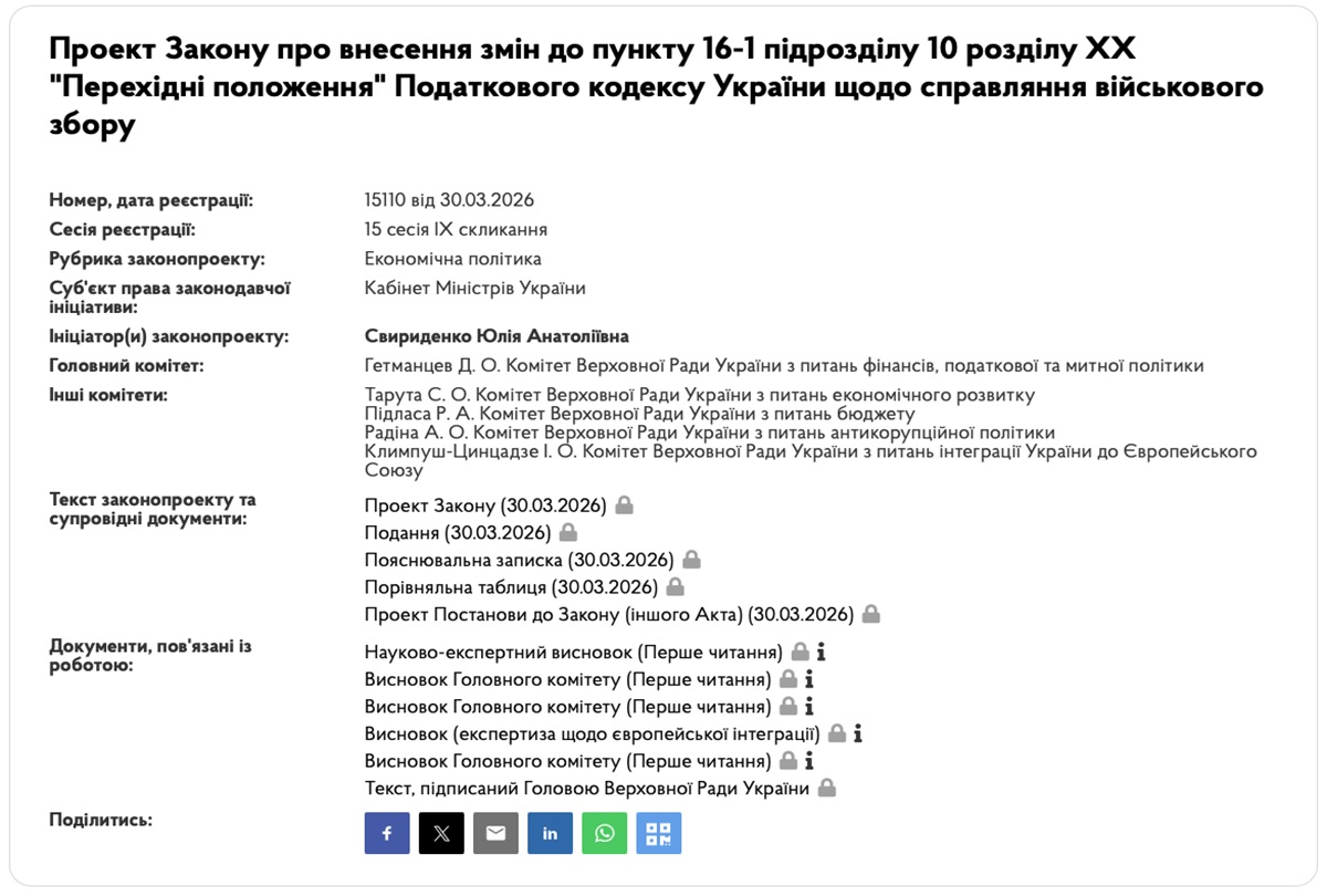 7 квітня ВРУ прийняла у ІІ читанні та в цілому законопроєкт №15110 про внесення змін до п. 16-1 підрозділу 10 розділу XX «Перехідні положення» ПКУ щодо справляння військового збору. Про це повідомив Железняк у своєму Телеграм-каналі.
