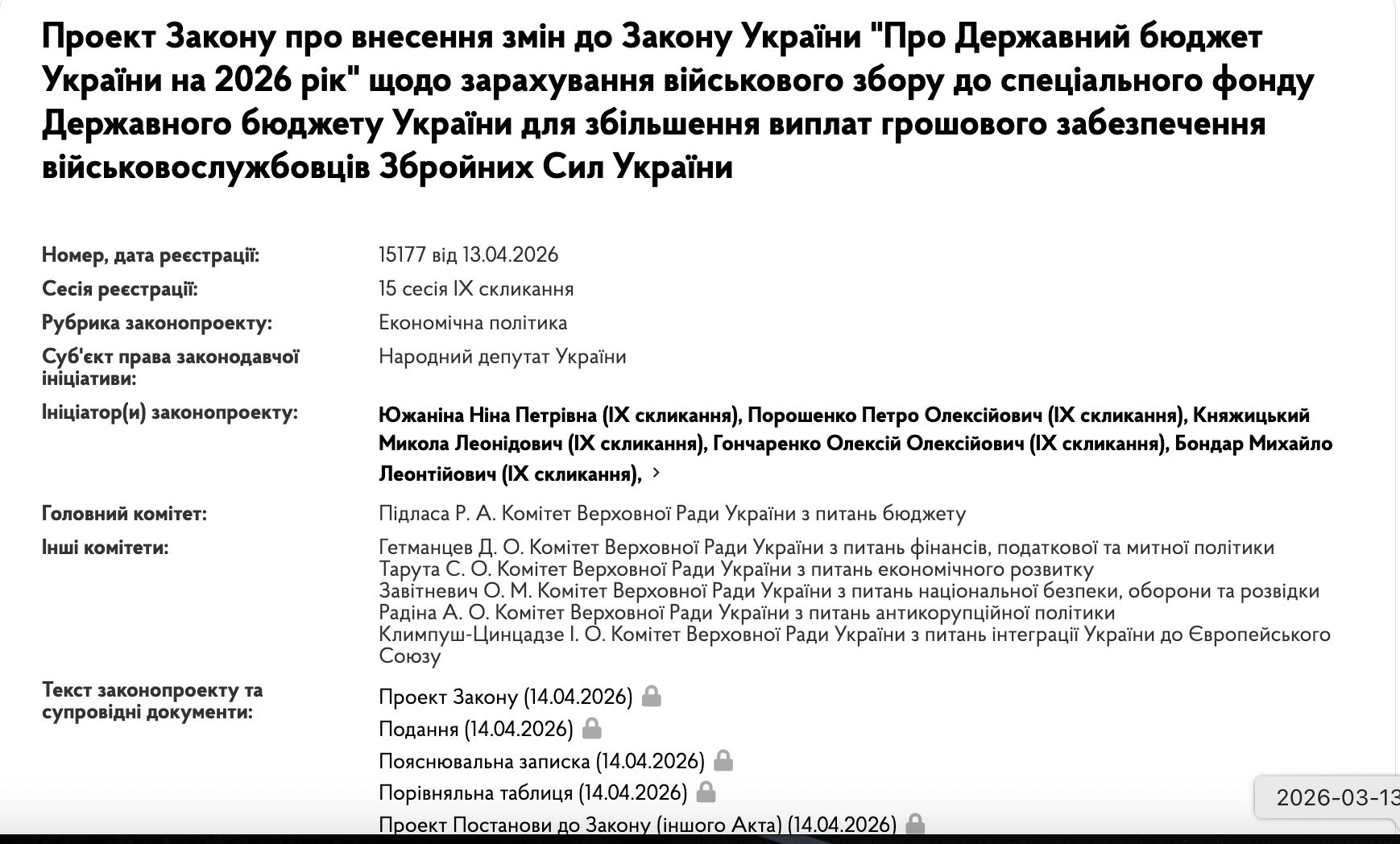 13 квітня 2026 у ВРУ зареєстровано проєкт Закону №15177 "Про внесення змін до Закону України "Про Державний бюджет України на 2026 рік" щодо зарахування військового збору до спеціального фонду Державного бюджету України для збільшення виплат грошового забезпечення військовослужбовців Збройних Сил України". Його авторами є Н. Южаніна, П. Порошенко та ін.