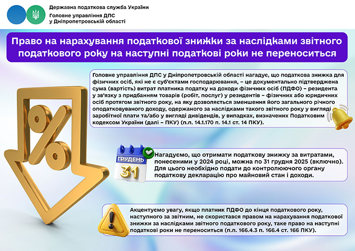 ДПС у Дніпропетровській області нагадує, що податкова знижка для фізичних осіб, які не є суб’єктами господарювання, – це документально підтверджена сума (вартість) витрат платника податку на доходи фізичних осіб (ПДФО) – резидента у зв’язку з придбанням товарів (робіт, послуг) у резидентів – фізичних або юридичних осіб протягом звітного року, на яку дозволяється зменшення його загального річного оподатковуваного доходу, одержаного за наслідками такого звітного року у вигляді заробітної плати та/або у вигляді дивідендів, у випадках, визначених Податковим кодексом України (далі – ПКУ) (пп. 14.1.170 ПКУ).