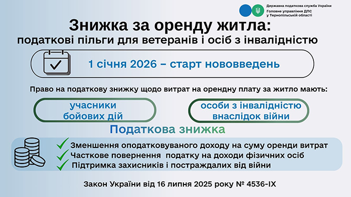 ДПС у Тернопільській області розповідає, що з 1 січня розширено перелік платників податку, які мають право скористатися податковою знижкою за витратами на оренду житла.