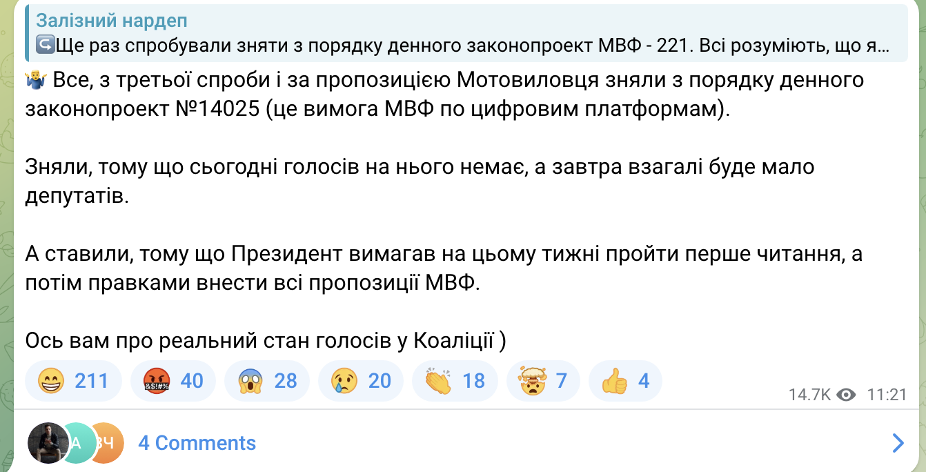 11 лютого на засіданні ВРУ, як розповів Я. Железняк, з третьої спроби і за пропозицією Мотовиловця зняли з порядку денного законопроєкт №14025 (це вимога МВФ по цифровим платформам). Як пояснив нардеп: