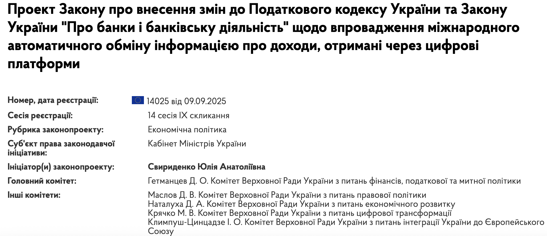 Перша спроба прийняти за основу урядовий проєкт Закону №14025 "Про внесення змін до Податкового кодексу України та Закону України "Про банки і банківську діяльність" щодо впровадження міжнародного автоматичного обміну інформацією про доходи, отримані через цифрові платформи" відбулася 16 грудня 2025. Але ВРУ не зробила цього. Про це свідчить інформація від Железняка.
