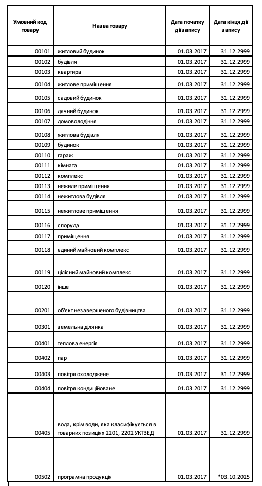 *Примітка до дати кінця дії запису щодо програмної продукції: у зв’язку із закінченням періоду дії положень, визначених у пункті 261 підрозділу 2 розділу ХХ «Перехідні положення» Податкового кодексу України щодо звільнення від оподаткування ПДВ операцій з постачання програмної продукції, а також операцій з програмною продукцією, плата за які вважається роялті згідно з абзацами другим – сьомим підпункту 14.1.225 пункту 14.1 статті 14 Податкового кодексу України
