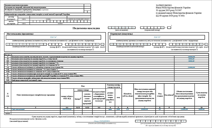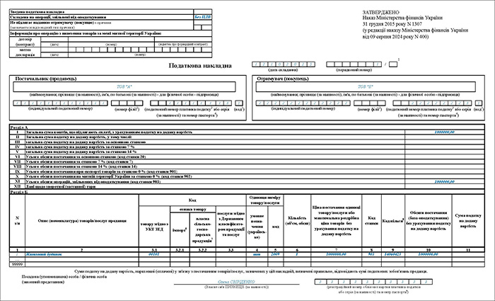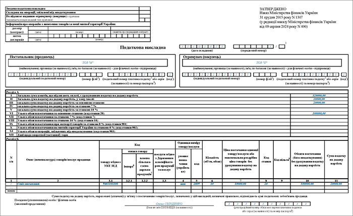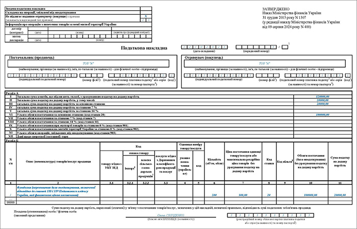Форму податкової накладної затвердив наказ Мінфіну від 31.12.2015 №1307. Втім, до неї час від часу вносяться зміни, а складати податкову накладну треба за формою, яка діє на дату складання. Актуальний бланк податкової накладної дивіться на нашому сайті за посиланням