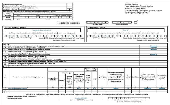 Приклад 3. ФОП – платник ПДВ надав ТОВ-платнику ПДВ послуги (оренда офісу) на суму 1 200 000 грн, у тому числі ПДВ 200 000 грн. Постачання послуг – перша подія (податкова накладна складається датою складання акту приймання-передачі наданих послуг). Як скласти податкову накладну в такому випадку?
